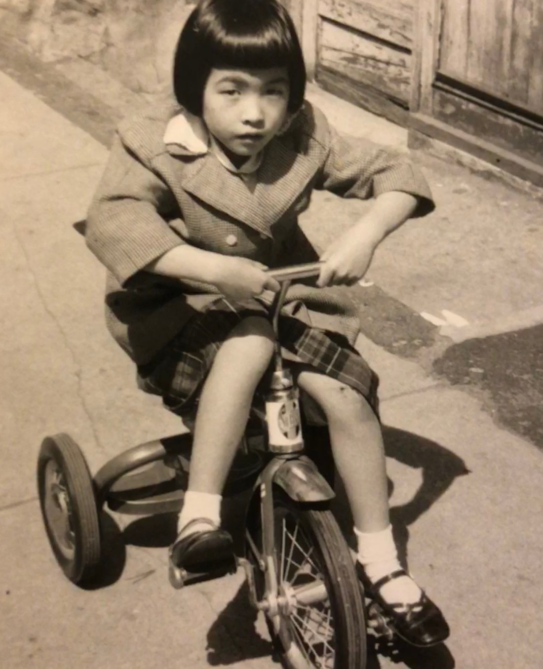 Top: Cynthia Yee on 1950’s Hudson Street , riding her much outgrown, trusty tricycle , nosying around for what would be material for her future work as a writer.