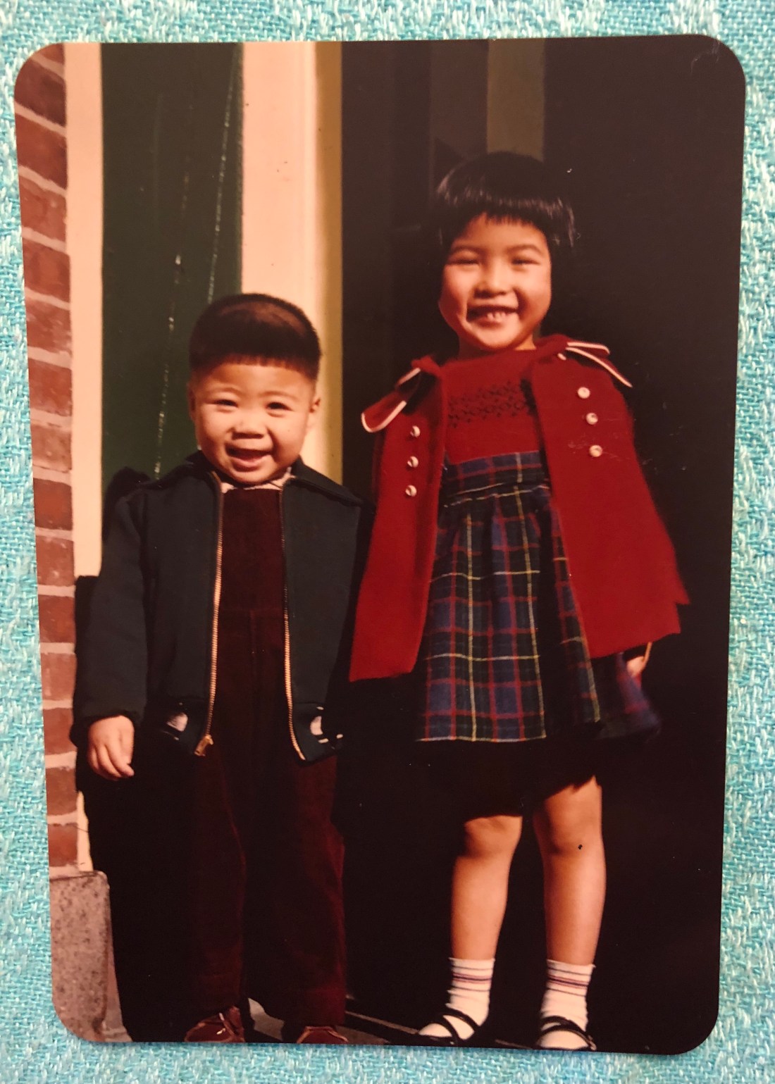Bottom: Cynthia Yee and her playmate, her cousin Albert Yee, in the doorway of their rowhouse home at 116 Hudson Street.