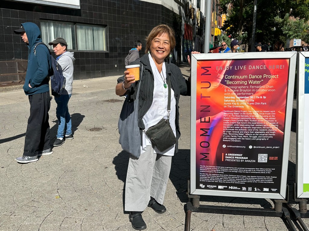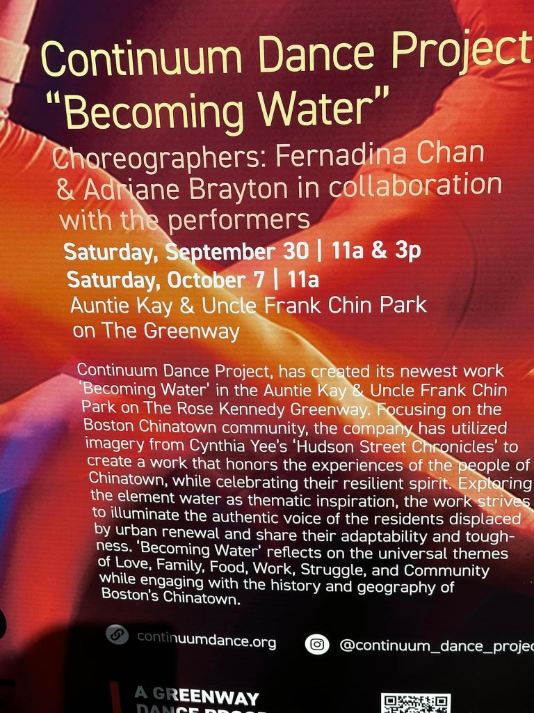 I am so pleased that Hudson Street Chronicles became the primary research source for the choreography of “Becoming Water,” by the Continuum Dance Project, choreographed by co-directors, Fernadina Chan and Adriane Brayton as part of the Momentum Greenway Dance Program, presented by Amazon, 2023. I recorded a bilingual Taishanese/English voiceover of 12 quotes from my stories , selected by Fernadina Chan, and recorded by sound engineer, Dave Jamrog, at The Record Company . The performances were on 2 Sundays , October 1st, 2023 at 11:00 -11:30 and 3:00 -3:30 and October 8, 2023 at 11:00-11:30 at the Aunty Kay and Uncle Frank Chin Park next to Boston’s Chinatown Gate.